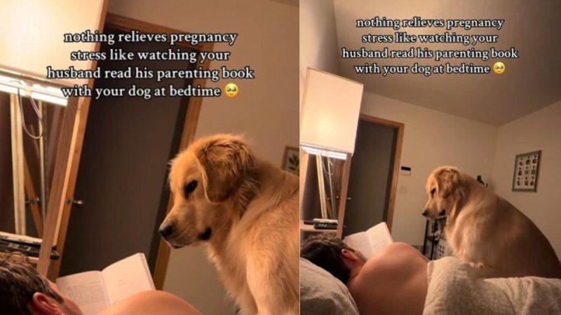 In the clip, Jennifer Anna, a mother-to-be, documented a cozy moment at night in bed when their floof joined her and her husband for their nighttime routine. It showed her partner reading a pregnancy book before catching some Z’s when their Golden boy decided to also indulge in the moment and make it a family activity. The pooch sat by his dad and constantly looked at him as he read a few pages from his guide, gearing himself up with the facts.